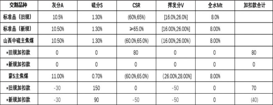 根据大商所焦煤交割新规(F/DCE JM004-2025)对比旧规(F/DCE JM003-2022)的质量加扣款条款,我们选取主流质量指标的山西中硫主焦煤仓单与蒙5主焦煤仓单在新旧规则下加扣款情况对比统计如下表: