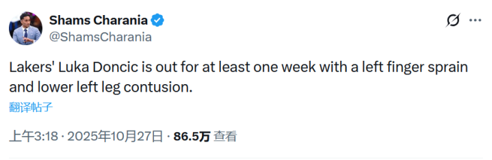 Shams报道,东契奇将至少缺席一周。原因是左手手指扭伤以及左腿挫伤。记者Dave McMenamin补充到,东契奇将在大约一周后接受重新评估。在上一场湖人队对阵森林狼队的比赛中,东契奇便在比赛中出现手指受伤的现象,当时队医紧急在暂停期间为他治疗,随后东契奇选择带伤继续作战,并带领湖人队拿到新赛季首胜。
