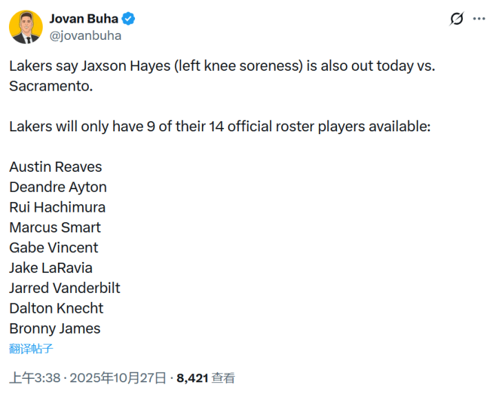这样一来,湖人队14人大名单目前仅有9人可出战,他们分别是:里夫斯、艾顿、八村垒、斯玛特、文森特、拉拉维亚、范德比尔特、克内克特、布朗尼。