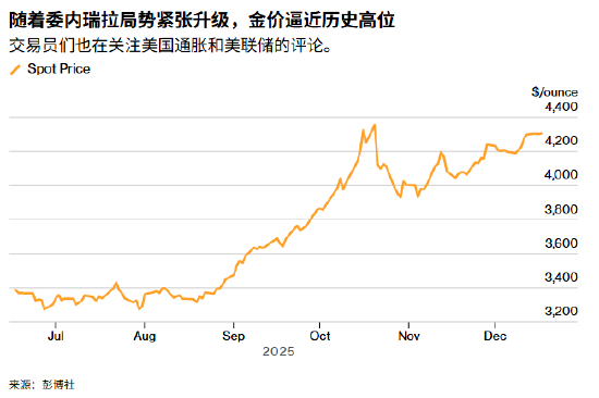 黄金价格距离去年10月创下的每盎司4381美元的历史高位已不远。今年以来,黄金价格已上涨约三分之二,有望创下自1979年以来最佳年度表现。这波强劲上涨行情主要得益于各国央行加大购入力度,以及投资者普遍抛售政府债券和主要货币。地缘政治紧张局势也增强了黄金的避险吸引力。