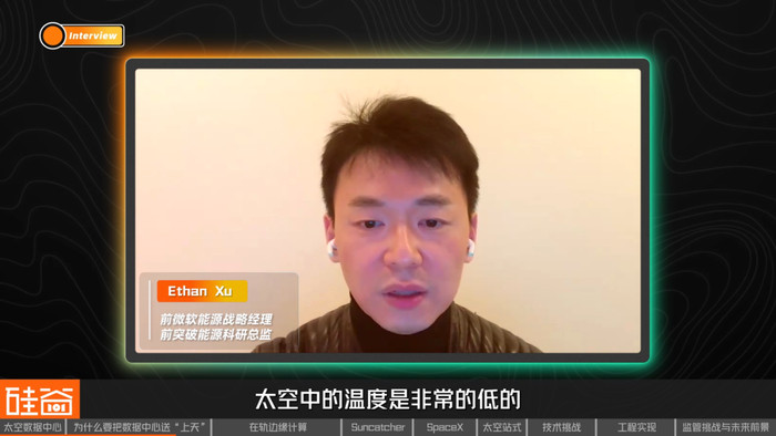 AI运行会产生巨热,而太空背景温度仅为3开尔文(约-270℃),只需将散热器背对太阳,就能获得高效的自然冷却。在真空环境中,热量不需要被“搬走”,而是可以以辐射的方式向深空释放。我们可以通过巨大的辐射散热板,直接把废热丢进宇宙,前微软能源战略经理EthanXu告诉我们,这意味着PUE(能源使用效率)可以无限逼近于1。