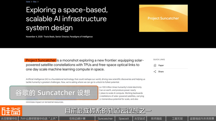 目前最成体系的轨道云设想之一,来自谷歌内部的SuncatcherProjec(“捕光者”计划),它的核心思路是:在轨道上部署相对固定位置的算力平台,通过持续稳定的太阳能供电,为地面的数据中心提供算力补充。