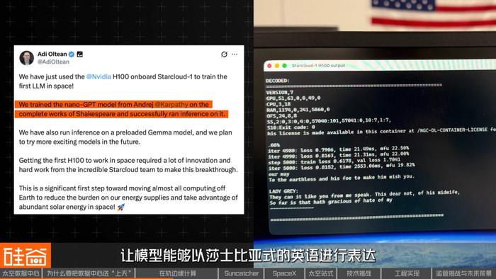 截至目前,它在太空中完成了几个重要任务:一是成功调用了谷歌的开源模型Gemma,并向地球发出了“Hi地球人,你们好”的问候,仿佛一个地外智慧生命;二是使用莎士比亚全集训练由OpenAI创始成员AndrejKarpathy打造的NanoGPT,让模型能够以莎士比亚式的英语进行表达;三是实时读取传感器数据,进行实时情报分析,比如瞬间识别野火热信号等,并及时通知地面人员。